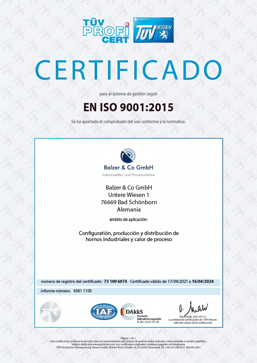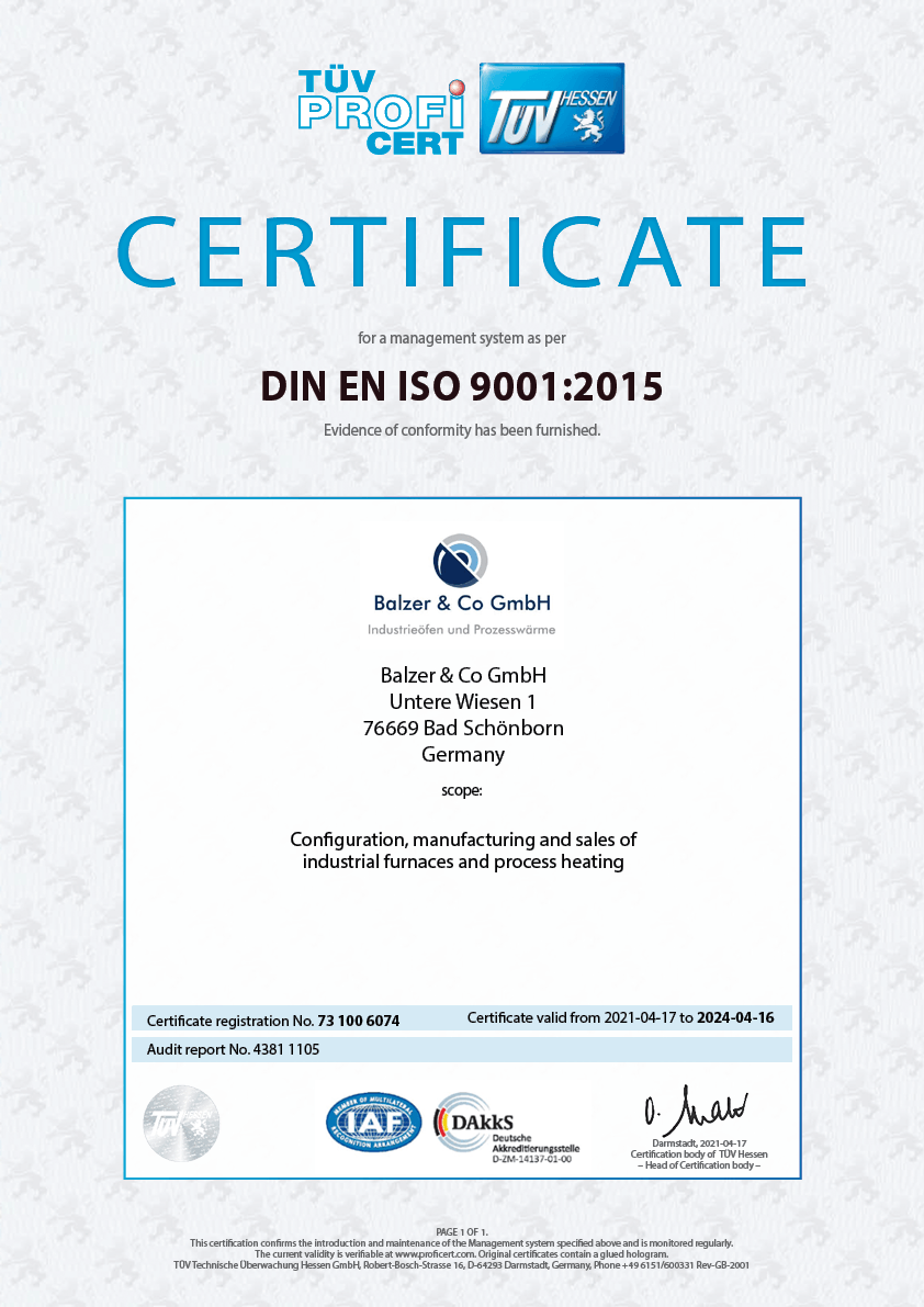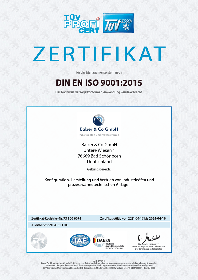 Die Firma Balzer ist nach der neuen Norm DIN ISO 9001 : 2015 durch den TÜV Hessen zertifiziert.